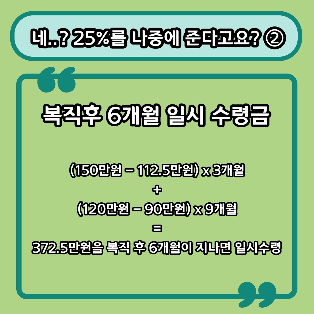 80%의 75%만, 50%의 75%만 지급하여 주고 나머지는 복직후 6개월 후에 일시불로 지급받게 되는데요.